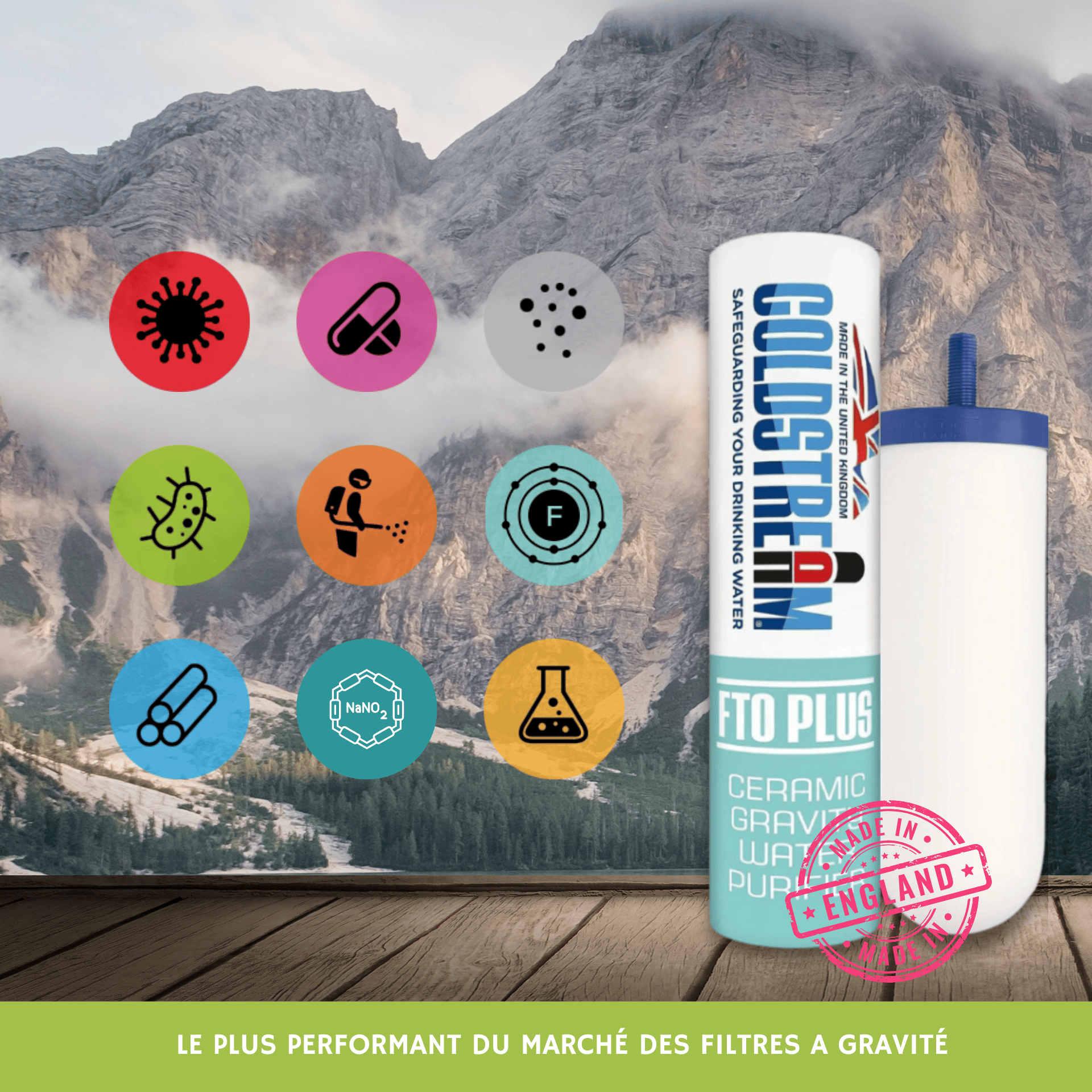 The Coldstream FTO Plus Ceramic Water Filter consists of two key components: a unique, specially formulated ceramic outer layer that provides protection against bacteria and harmful substances such as PFAS, particulates and microplastics. The inner layer is made of a layer of black granular carbon. This filter protects against fluoride, heavy metals, chemicals and more. Place the FTO Plus filter in your gravity system to ensure safer, healthier and better tasting drinking water. It is ideal for use in the home, gyms and spas, off-grid installations and is also used by international humanitarian organisations. Compatible with Berkey, ProOne, Doulton and British Berkefeld filtration systems. One FTO+ filter purifies 1500 litres of water and should be replaced every six months. Filter life may vary depending on water quality, which may require more frequent replacement in areas with highly polluted water.